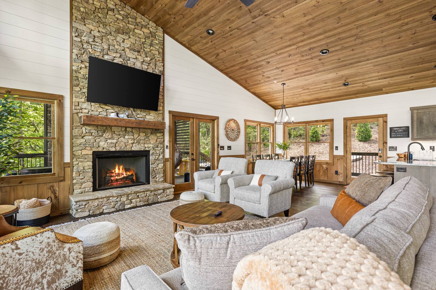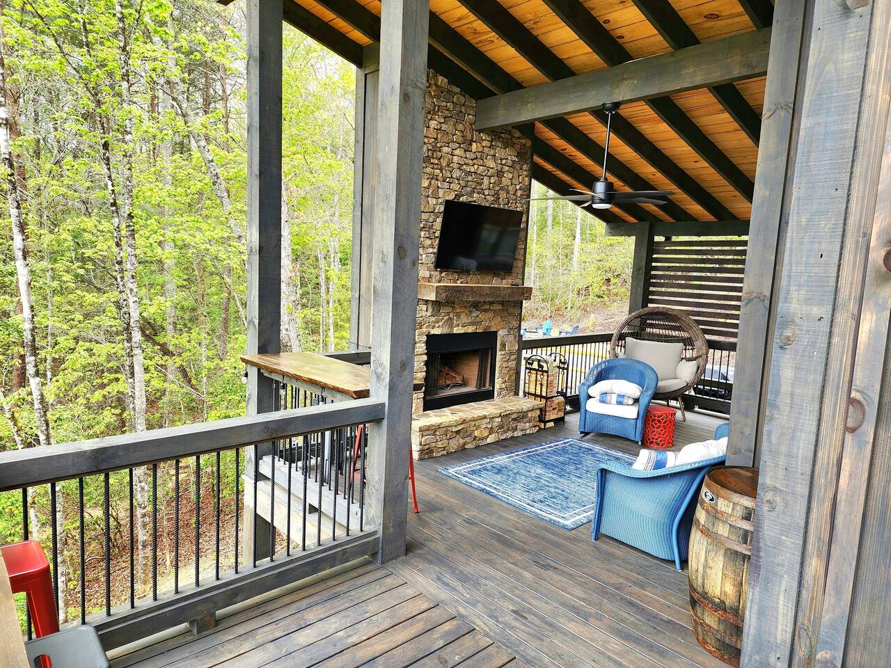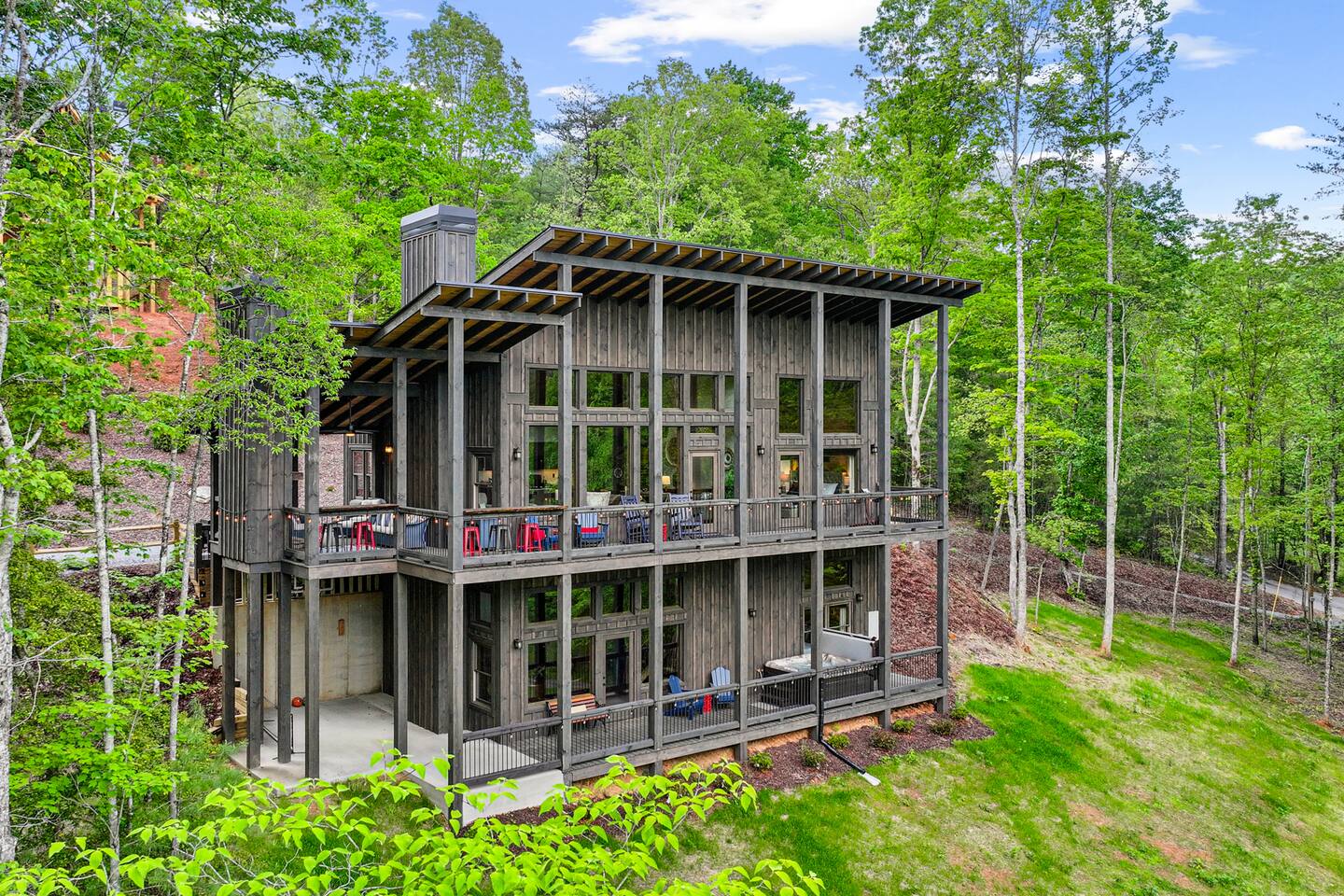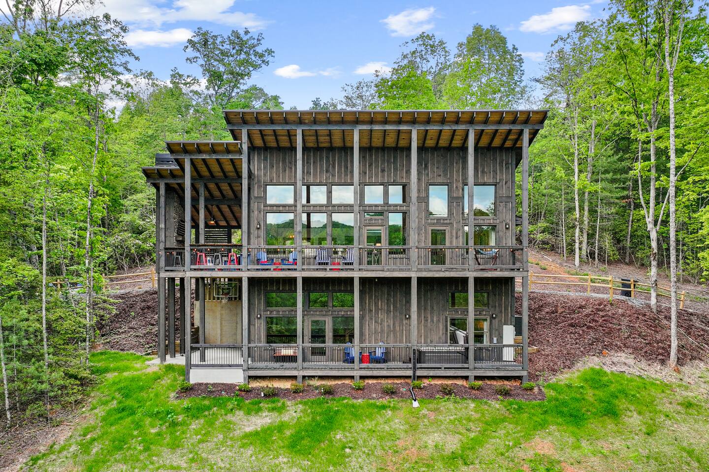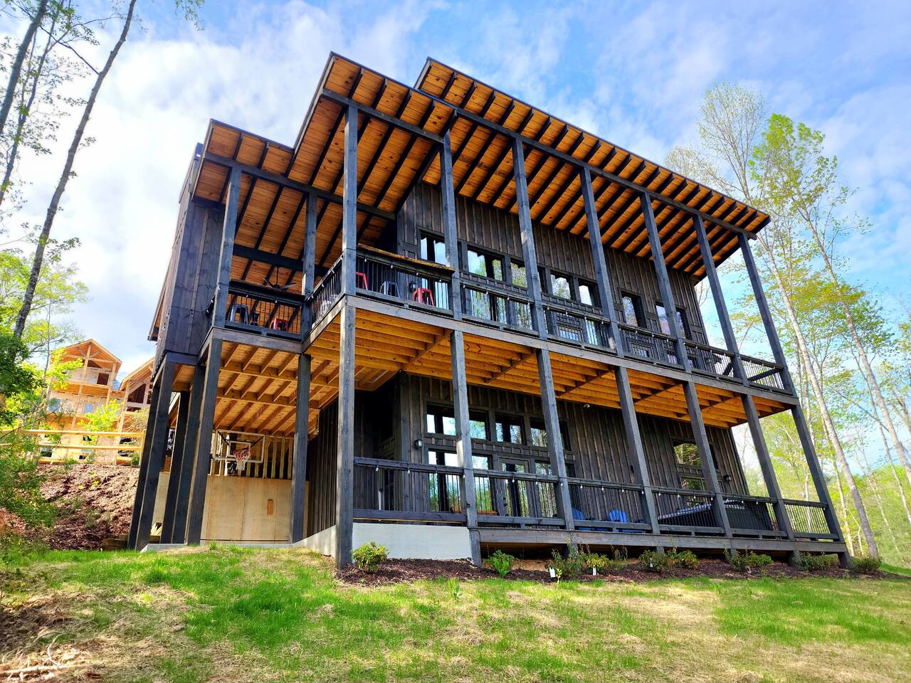 Welcome to Our New Chalet! Located a short, paved picturesque 15-minute drive from downtown Blue Ridge, our new, modern rustic chalet is now open for guests. With soaring ceilings, fire pit, multi-level decks, and three fireplaces, the cabin is designed for comfort and style. There's something for everyone, with a game room, a covered basketball court, and a speakeasy-style lower level where adults can unwind and enjoy classic albums. Be among the first to experience this luxurious retreat!