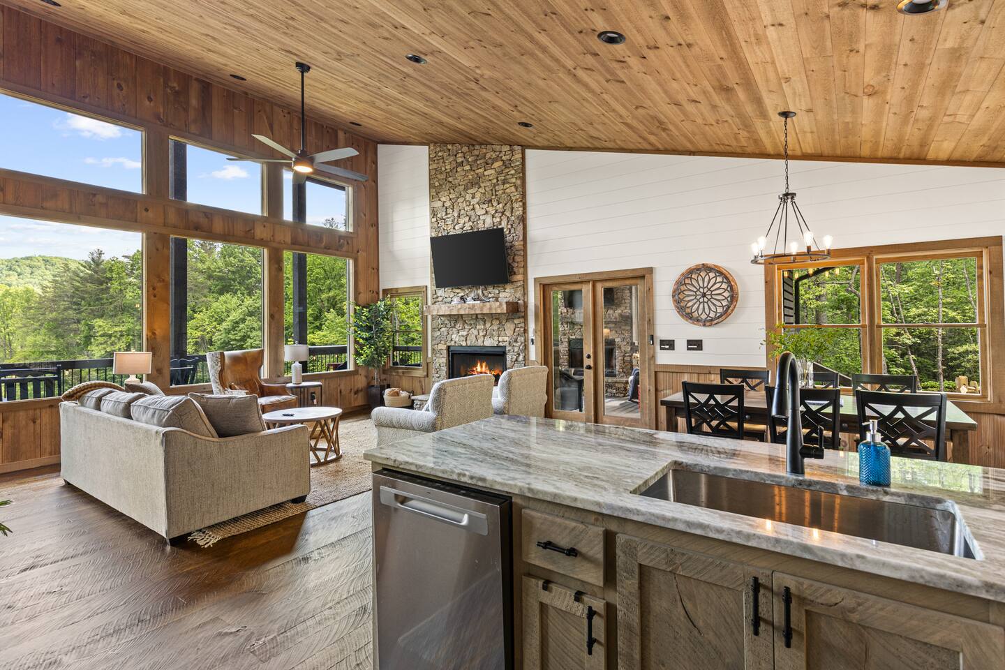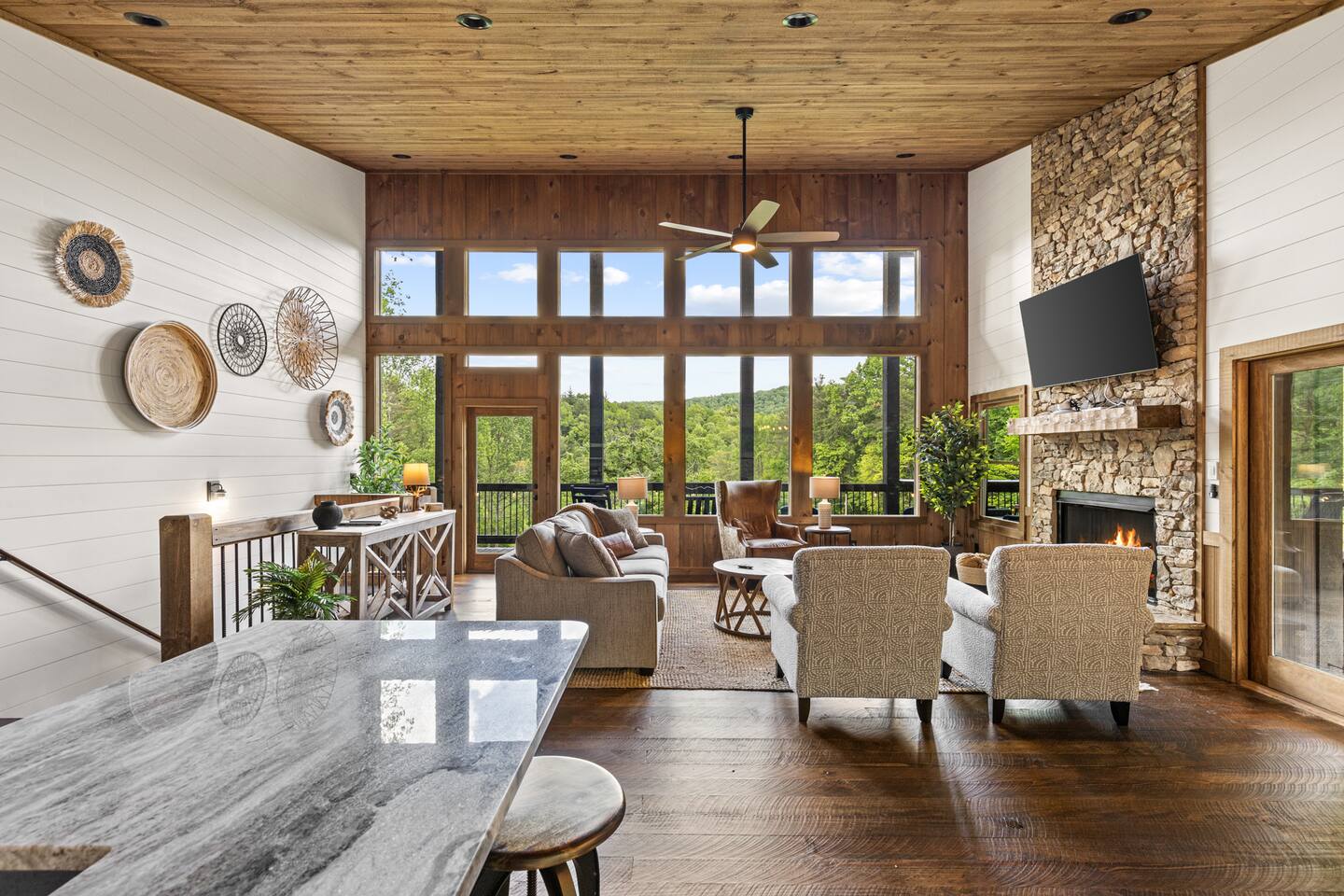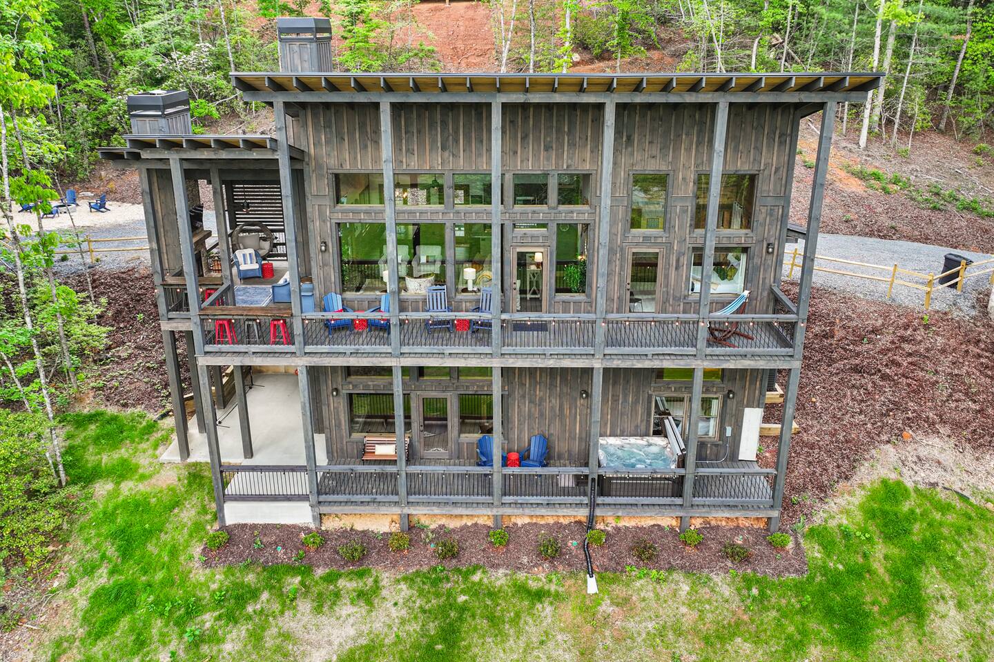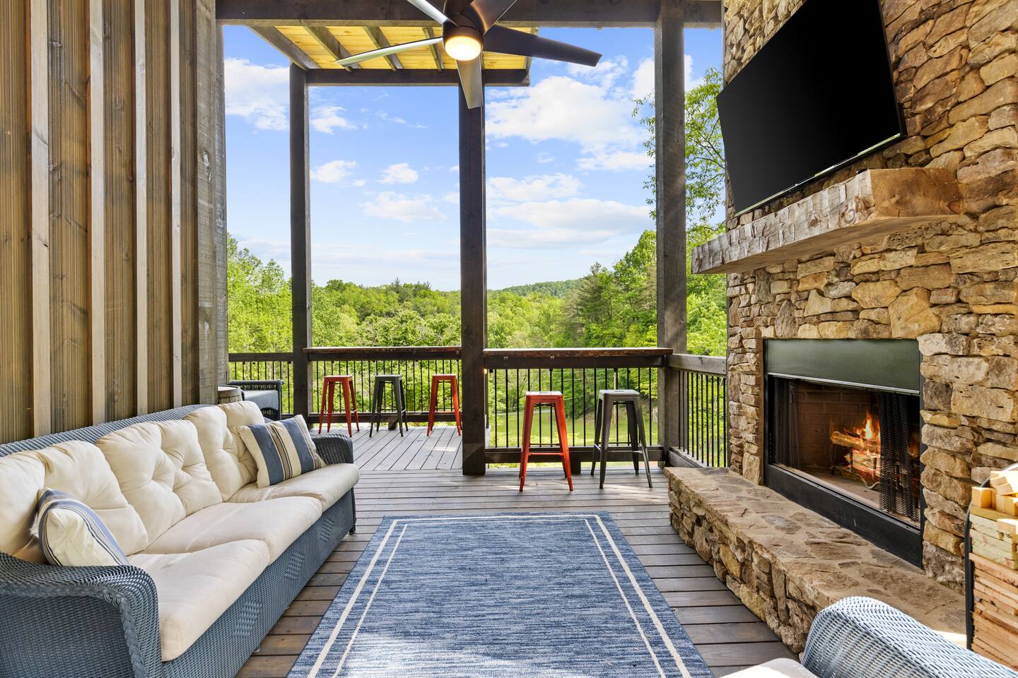 Welcome to Our New Chalet! Located a short, paved picturesque 15-minute drive from downtown Blue Ridge, our new, modern rustic chalet is now open for guests. With soaring ceilings, fire pit, multi-level decks, and three fireplaces, the cabin is designed for comfort and style. There's something for everyone, with a game room, a covered basketball court, and a speakeasy-style lower level where adults can unwind and enjoy classic albums. Be among the first to experience this luxurious retreat!