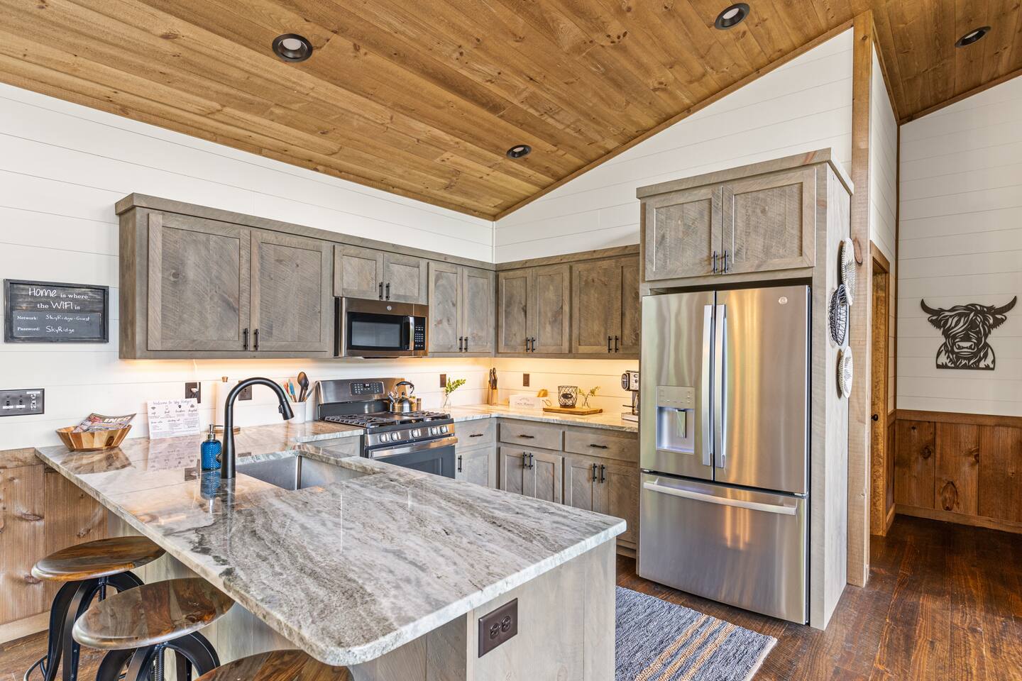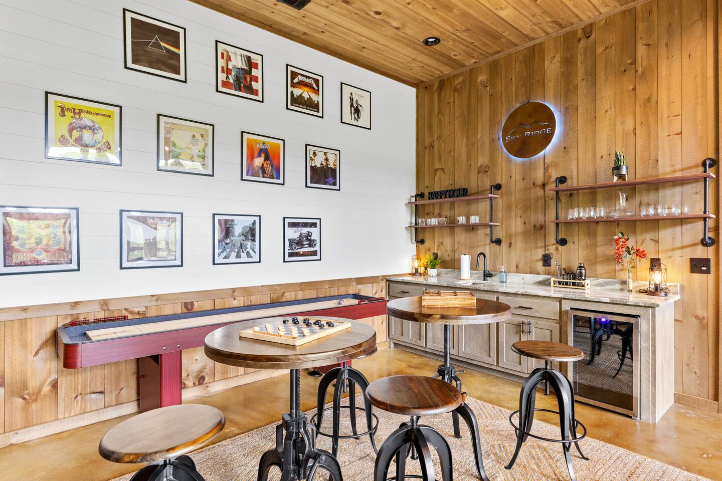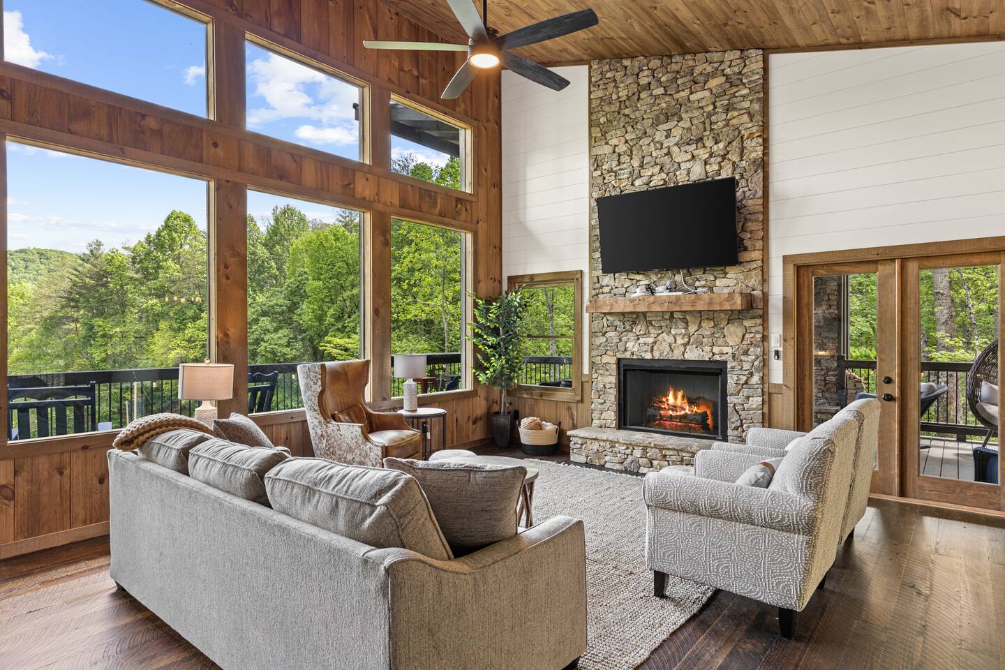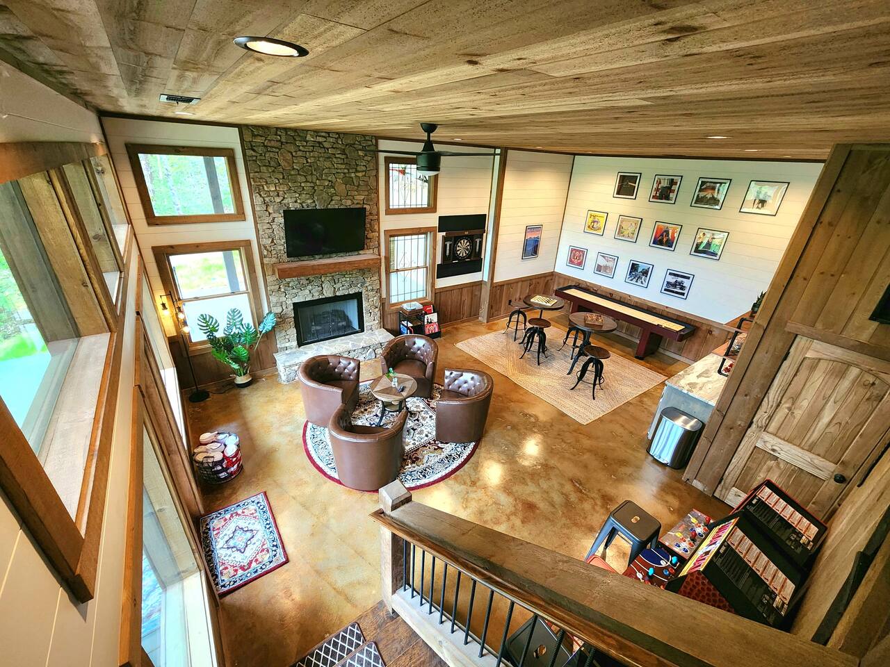 KEY FEATURES > Stunning Blue Ridge mountain views > 15 mins to heart of downtown Blue Ridge > Paved roads door-to-door > 16’ ceilings on main floor, 14’ ceilings in lounge/gameroom, 20’ ceilings in outdoor deck > 5 different wood types throughout the cabin > Views from hot tub and both decks > Fire pit > Fully loaded kitchen > 3 standing arcade machines, shuffleboard table, darts, record player > Covered regulation height basketball court > Loaded wet bar in lounge/gameroom > 2 indoor fireplaces and 1 outdoor wood-burning fireplace > BBQ grill > TVs in every room (and outside on the deck), stream to your heart’s desire > Workstation/desk with monitor looking out over the pasture After enjoying a safe and scenic drive on fully paved roads door-to-door to SkyRidge, step inside and be greeted by ★★striking 16-foot ceilings★★ and floor-to-ceiling windows that frame breathtaking mountain views. The main living room invites you to relax on a plush sofa in front of the fireplace while streaming your favorites on the 65” Smart TV. The multi-level decks are absolutely magnificent. The decks are monumental in height, with the cabin roof soaring a whopping 20’ overhead. We cannot promise you will see them, but if you read our reviews MANY guests rave about the ★★family of deer★★ that frequently graze in the meadow just below and out in front of the decks. Our guests often see them early in the morning and at dusk, and I hope you do too! Downstairs, the lounge and game room is a hub of entertainment with a gas fireplace, tufted leather seating, a fully loaded wet bar, a big screen TV, shuffleboard, darts, and three standing arcade machines. For outdoor fun, challenge your group to some hoop on the regulation height ★★covered basketball court★★. Even on cold nights, socializing in front of the ★★outdoor wood-burning fireplace★★ is so comfy and fun! The decks are furnished with rocking chairs, two live-edge wooden bars, and a cot. Just outside of the lounge/game room on the deck, unwind in the hot tub. Or stroll out to the ★★fire pit★★ to cook smores and enjoy cocktails under the stars. After a day of adventure, retreat to one of three peaceful bedrooms: ✔ Bedroom 1: A main-level sanctuary with a king-sized bed and a private ensuite bathroom featuring dual sinks and a spacious walk-in shower. ✔ Bedroom 2: A cozy lower-level room with a queen-sized bed and access to a full hall Bathroom. ✔ Bedroom 3: Perfect for kids or groups, this lower-level room has two twin-over-twin bunk beds plus two twin trundles. ★★ Kitchen ★★ The kitchen at SkyRidge is fully appointed with modern appliances and everything you need to prepare delicious meals. ✔ Fully-stocked kitchen with modern appliances ✔ Complimentary coffee ✔ Extensive cookware and dinnerware ★★ The Neighborhood ★★ Nestled in a private setting adjacent to the Cohutta Wilderness National Forest, SkyRidge offers the perfect balance of seclusion and convenience. You are perfectly situated between the charming downtowns of McCaysville and Blue Ridge, making it easy to explore the area's best attractions. Nearby activities include: ✔ Fishing for trout on the Toccoa River ✔ Apple picking at Mercier Orchards ✔ Visiting local wineries and breweries ✔ Hiking and mountain biking in the Aska Adventure Area ✔ Riding the Blue Ridge Scenic Railway ✔ Shopping and dining in historic downtown Blue Ridge ★★ Guest Access ★★ You will have private access to the entire cabin and surrounding property. Check-in is simple and convenient with a keypad on the front door; your unique code will be sent before your arrival. Ample parking is available in the spacious driveway. Feel free to work or stream with free, high-speed WiFi available throughout the home. ★★ Getting Around ★★ The cabin is easily accessible year-round via paved roads and a paved driveway, so a 4x4 vehicle is not required and driving is extremely safe for any age. Ample parking is available for multiple vehicles. ★★ House Rules ★★ To maintain the pristine condition of our cabin for all guests, pets are not permitted at this time. ★★ Important Information ★★ Our property is located in a natural setting, and you may encounter local wildlife like deer. We recommend bringing bug spray if you plan to spend time outdoors in the evenings. For your safety and security, exterior security cameras are located on the property.